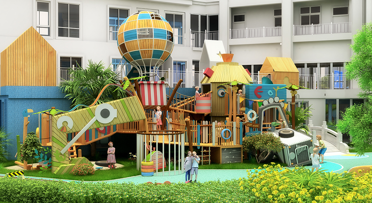 设计秉承教育回归自然的教育理念,将自然生态与卡通童趣相融合,使用原生态的木质为主体结构,不仅能使幼儿感知大自然,还能使他们在大自然梦工厂中进去玩耍。