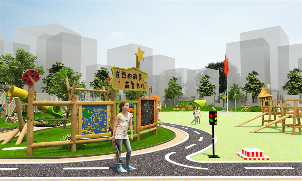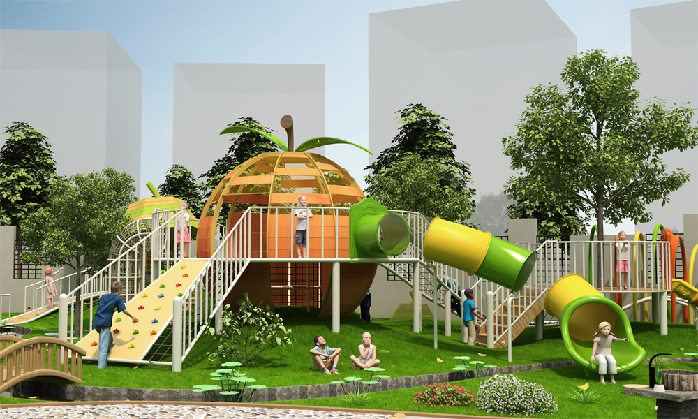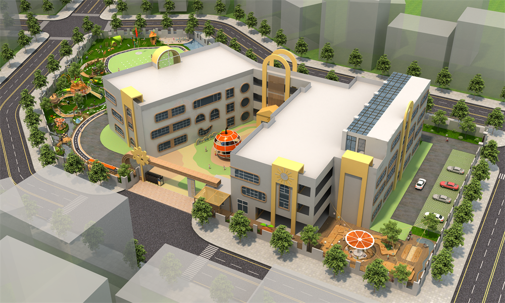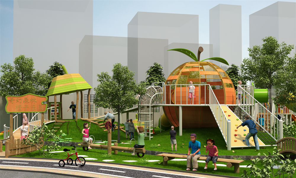该园所地处丹棱,橙子是丹棱的特产又代表积极向上和阳光。结合幼儿园的办园理念,自然的旅程,探索的伙伴,童梦的乐园,创造一个专属丹棱小朋友的乐园,将橙子作为设计元素贯穿整园户外儿童空间。