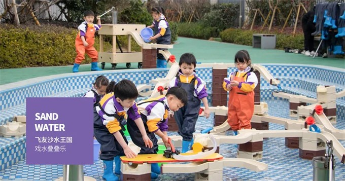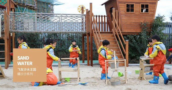 园区创设沙地、水池两处户外活动场地,配备了飞友沙水王国系列游戏产品,让孩子们沉浸感受自然世界的魅力。