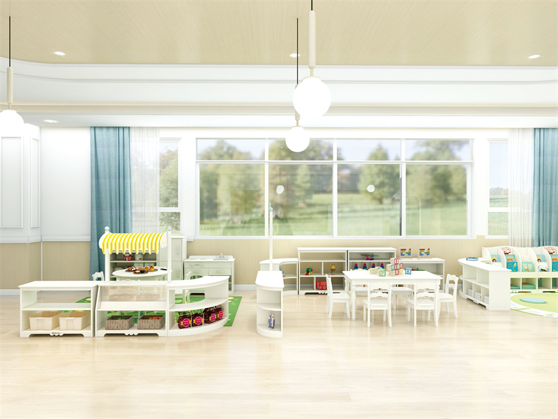 1、幼儿园家具的配置符合幼儿园教学要求,轻便,节省空间。幼儿园教学课程不同,用到的教学家具不同,有些家具比方美工柜可以增加轱辘便于移动。幼儿园各种区角,益智区、美工区、建构区等等,可以设计一些弧形柜子。
